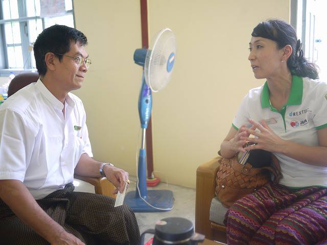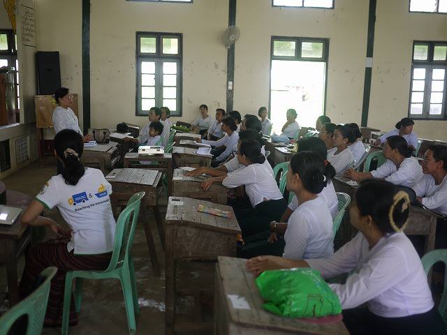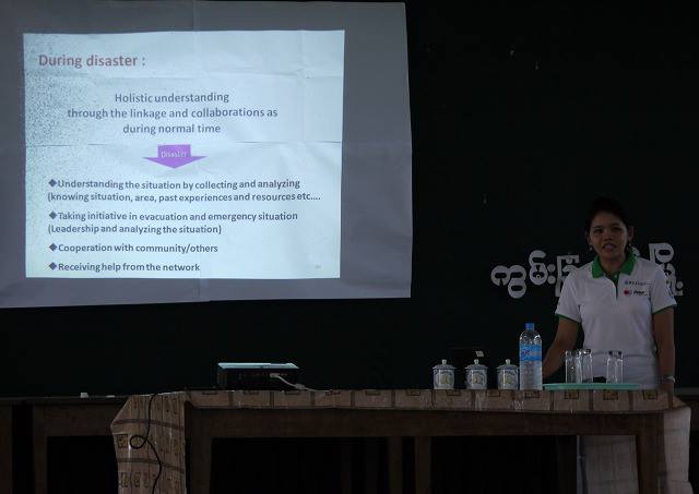 昨年度から継続している文部科学省の助成事業により、今まで防災教育を進めてきたクンジャンゴン校において、持続可能な開発のための教育(Education for Sustainable Development)の紹介をおこないました。これは、改革の渦中にあるミャンマーにおいて、次世代の子どもたちが安心・安全に暮らしていけるために、災害の教訓を遺し、学校や地域、学術や民間、国際社会など、様々な分野の「つながり」を育て、ミャンマーの豊かな自然を大切にしながら、災害に強い地域づくりと、その担い手を育てていくためのものです。日本の宮城県気仙沼市では世界に先駆けて、殆どの小中学校が実践し、東日本大震災の避難時や復興の過程においてESDの効果を発揮しています。ミャンマーではまだ導入期にありますが、今後防災を含めたこのESDの概念は、今後より一層重要性を増してくると思います。