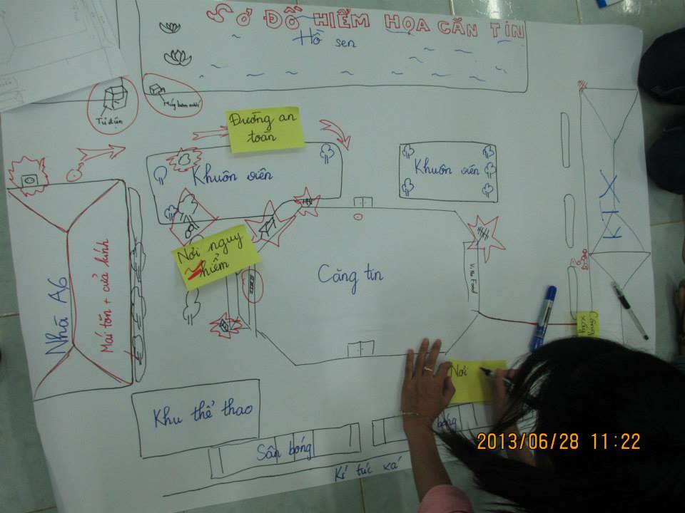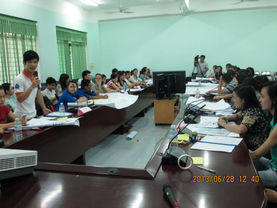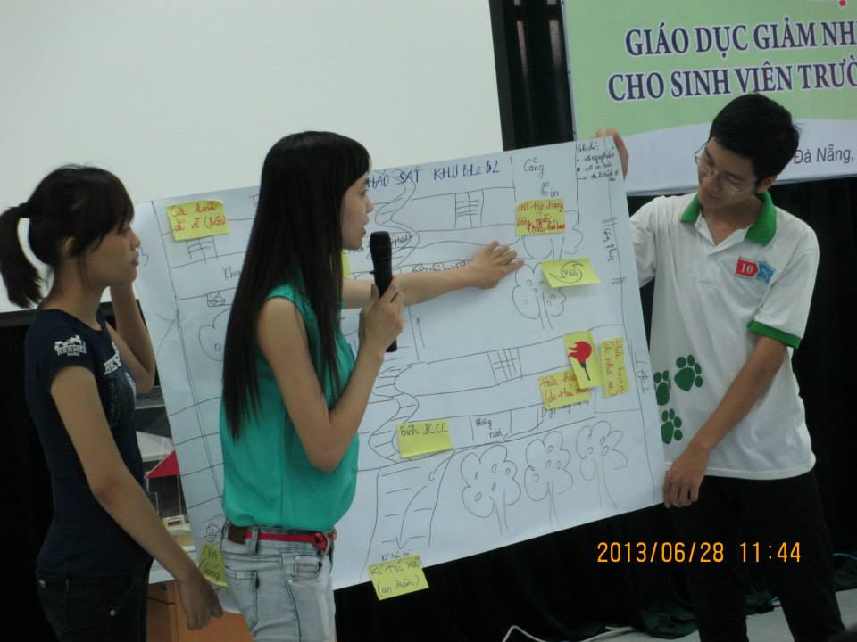 先週の木(6月27日)、卒業生の80%が教師になるというダナン教育大学で防災研修(TOT)第1日目が開かれました。プログラムはSchool Walking。学内の防災に対する危険箇所をチェックし、地図上に表示。結果、災害発生時の安全箇所・安全ルートを見つけ出すという活動です。 驚きました。描いた地図をグループ別にプレゼンするや否や、沢山の学生から質問攻めに遭い、プレゼン側は必死に応答しています。次のプレゼンも同様。これが10グループ全てのプレゼンで実施されたのです。研修の盛り上がりようったらありません。学生・トレーナーが一体化し、安全箇所目指して進んでいる高揚感が部屋中にみなぎっていました。 こんな中で過ぎたプログラム。学生は校内の安全箇所をしっかりと確認してくれたことでしょう。