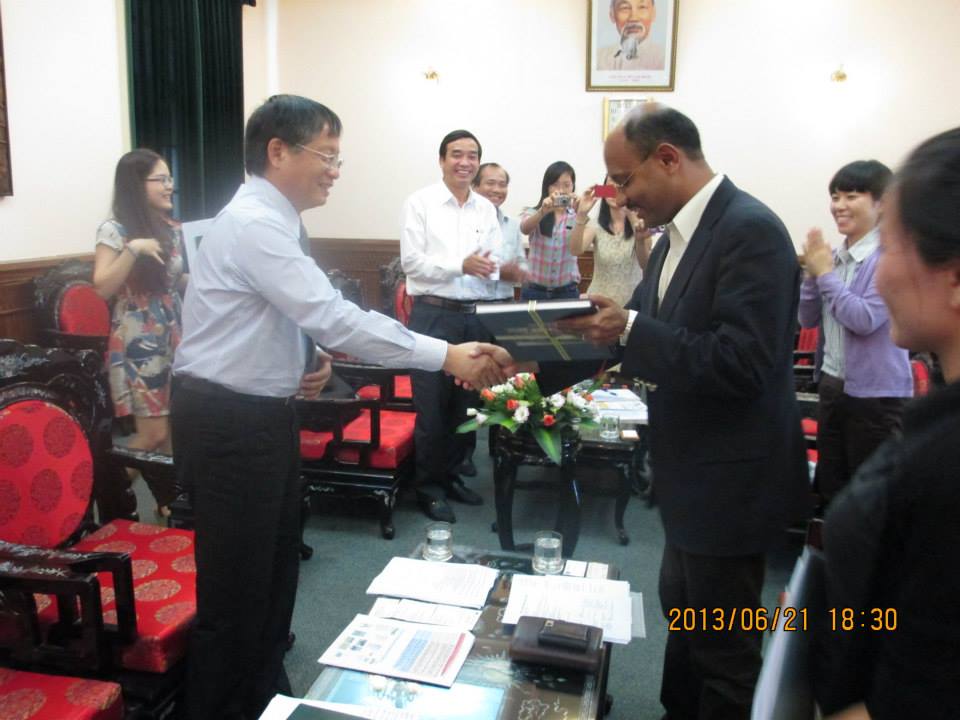 He stayed just 3 days from June 20 to 22, however, he has a significant mission. It was to get an understanding on sustainability of DRR education project planned and organized by Danang People’s Committee (P.C.) after SEEDS Asia (S.A.)’s implementation phasing. At 8 o’clock, June 21, Mr. Rajib checked DRR module, model, supplementary teaching material, game, picture story S.A. had created so far, at 9:00 had a meeting with Mr. Chinh, Director of Department of Education and Training (DOET) in order to get his understanding and cooperation on the mission. At 16:00, the meeting commenced at a conference room in PC building. 7 officials (including Deputy Chairperson Mr. Nguyen Ngoc Tuan) from P.C., 2 from DOET and 5 from S.A., totally 15 participated in the meeting. The meeting duration was 30 minutes, however, fully understanding was shown from P.C.. How splendid it is! Negotiation between P.C. and DOET seemed to be carried out in advance. P.S. Next day, June 22, one of Danang educational staff told us, “The meeting with P.C. was appeared on TV news.”