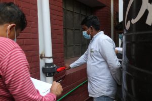The system, a distinctive feature of our school-based disaster risk reduction project in Dhaka, collects rainwater from the rooftop of the school building. The system includes treating the water, and utilizing it for firefighting. A water point was also installed as a water source in case of emergency, which could also be used for handwashing during normal times in order to promote hygiene to the students.